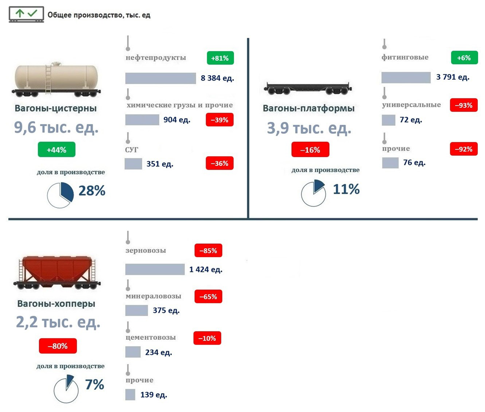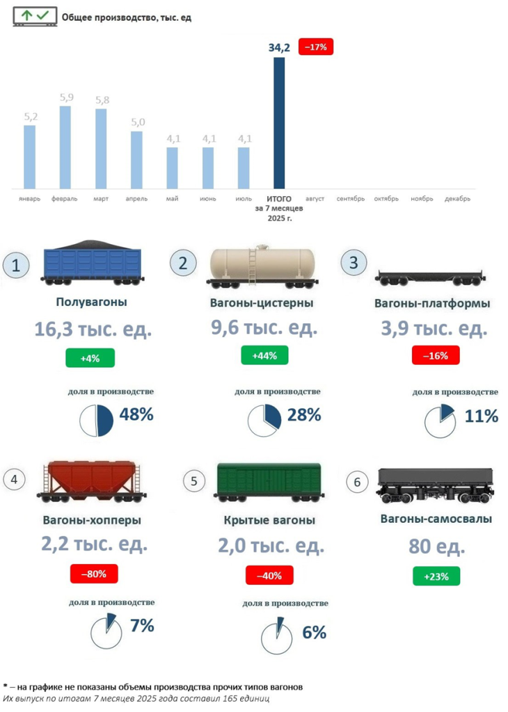 Общий выпуск вагонов – 34,2 тыс. единиц (падение 17% к АППГ).